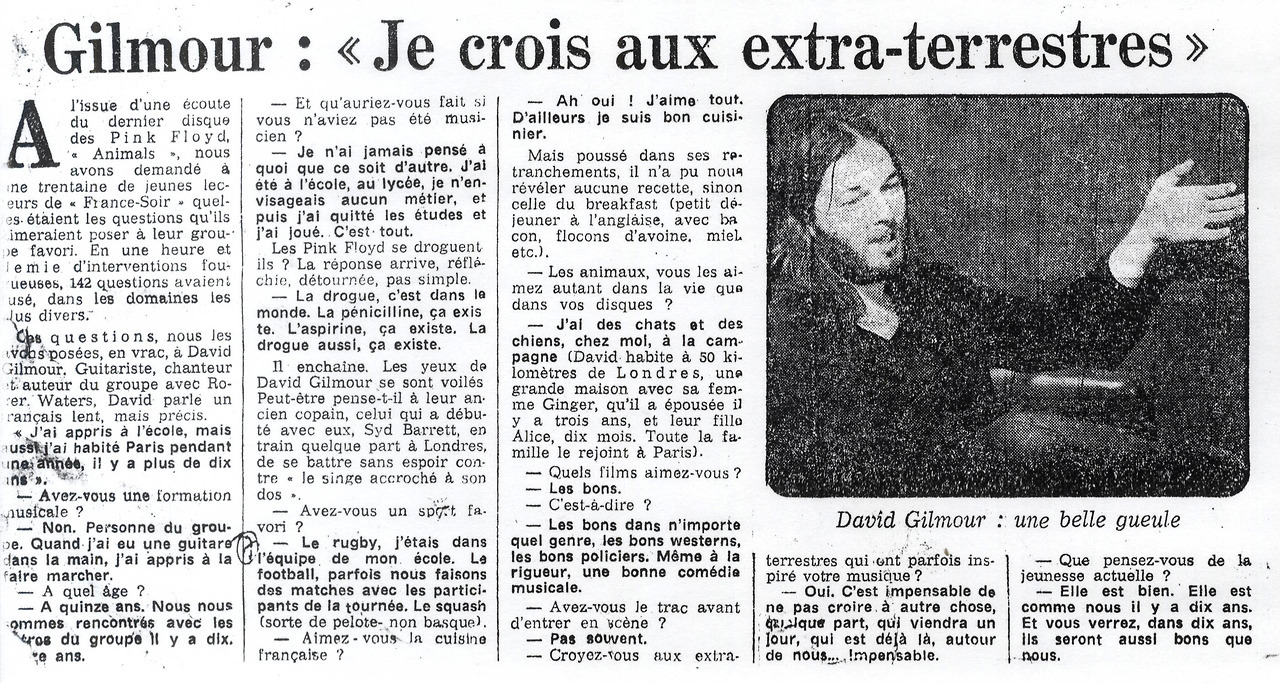 zajímavý výstřižek. co jsem z textu se svými slabými pozůstatky znalostí franštiny vyčetl, tak rozhovor byl spáchán po poslední desce animals, jsou v něm zmínky o jeho rodině a domově 50 km od londýna (croydon?), že má rád francouzkou kuchyni, ale není dobrý kuchař a že hrával ve škole v rugbyovém týmu. takže bych to tipoval na rok 1977 (nejspíš, když v paříži koncertovali s animals turné).